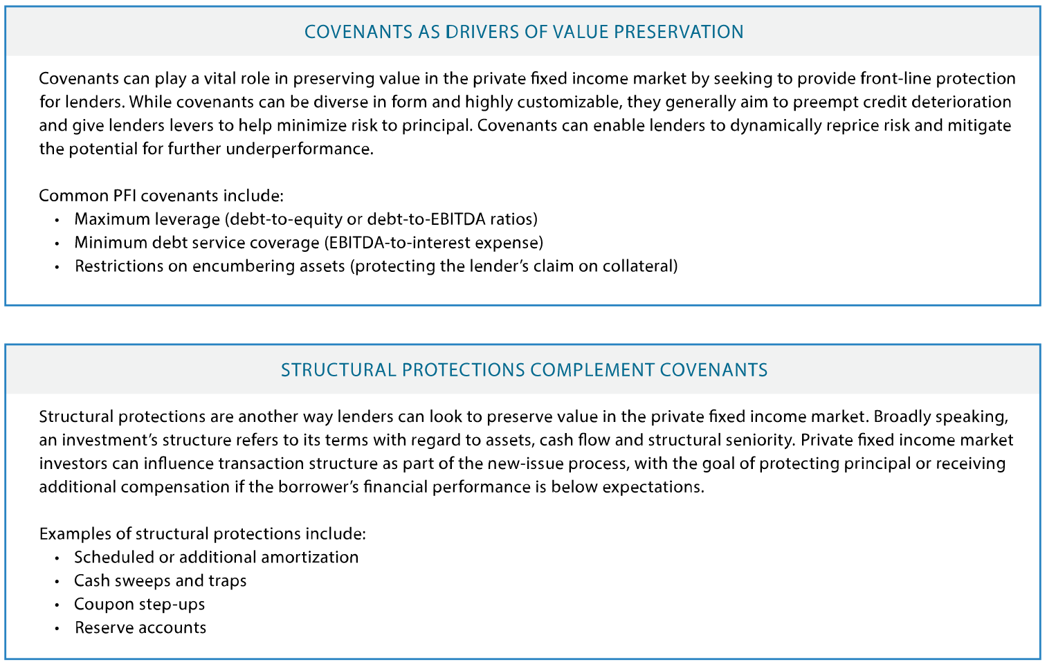 - Yield premia are dynamic. PFI’s yield advantage is comprised of an illiquidity premium and a complexity premium. The complexity premium is typically more constant, being a function of deal structure, while the illiquidity premium fluctuates as market conditions change. Hence, we think it is important to stay invested through the market cycle and avoid attempts at market- timing. Additionally, PFI can offer value through the cycle, not just when illiquidity premiums are high. In our view, it should not be seen as only a yield play. Covenants may be able to provide downside mitigation when it is needed most, and the asset class is a source of significant diversification potential. For these reasons, we believe PFI should be a staple allocation in an insurance company’s portfolio, not an opportunistic play.