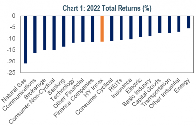 - Defensive sectors were less defensive. The high yield market underperformed Treasuries by over 350bps last year. Energy, typically a very cyclical sector performed well, with an excess return of 270bps, while the usually more stable Communications sector underperformed with an excess return of -810bps. Energy companies were beneficiaries of higher inflation given the rise in commodity prices, while Cable & Wireline sectors were pressured by higher capex requirements and rising funding costs.