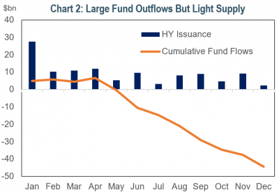 - Technicals were supportive despite fund outflows. Higher rate volatility and soft market sentiment kept many HY issuers on the sidelines. Supply totaled just over $100 billion in 2022, roughly 25% of what priced in 2020 and 2021. The heavier supply in those years pushed out the “maturity wall” and reduced the need for HY issuers to come to market in 2022. For those issuers that did come to market, it was a mixed bag – there were several “hung deals,” i.e., deals that did not get done, and there were deals that had to price with steep original issue discounts (OID). However, some deals performed well, proving the market was selective despite higher yields and demand was there for deals with the right terms and pricing. The low supply and roughly $100 billion of rising stars caused the HY market to shrink by 9% in 2022.