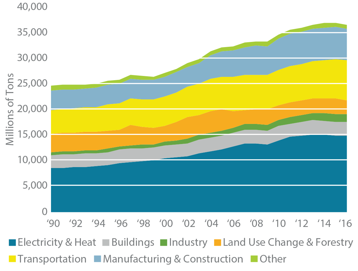 The rise in global temperatures is highly correlated to greater levels of atmospheric CO2. As a result, most efforts to fight climate change have focused on curbing additional emissions. Charts like the one in Figure 2 have played a major role in supporting the rise of renewable energy and alternative fuels in LP portfolios. They also explain why so many of the policy responses put forth by the world’s governments, including the EU, make these sectors a priority.