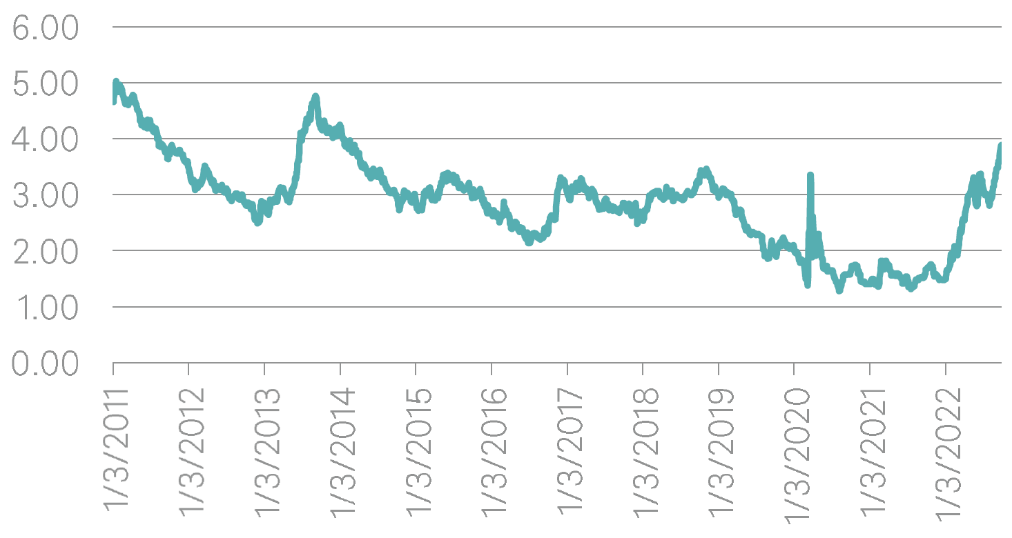 The intermediate part of the municipal bond yield curve, represented by the Bloomberg Muni 1-15 Year Blend, is much steeper than the Treasury yield curve. Unlike the Treasury market, the shape of the curve has less to do with any economic outlook considerations and is more representative of market demand nuances. Record outflows from one of the largest buyers in the market in 2022, mutual funds, has been offset on the front end of the yield curve by strong demand from separately managed accounts, depressing yields inside of 10 years. Approximately 90% of the yield on the entire municipal yield curve can be captured going out to fifteen years. When comparing the yield and duration of the Bloomberg Muni 1-15 Year Blend versus the overall Bloomberg Municipal Bond Index, investors can capture 89% of the yield (3.04% vs. 3.43%) with 67% of the duration (4.72 vs. 7.01 years). In fact, over the past decade, investment-grade intermediate munis have yielded more than 3% only one other time, for a hot minute in March 2020. We believe an intermediate allocation provides a good defensive place to find yield without as much price downside possibility than longer maturing bonds if interest rates continue to march higher.