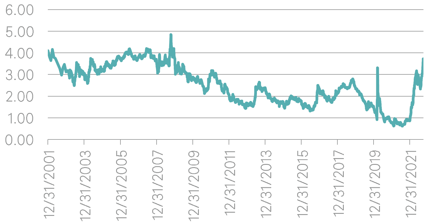 The sell-off this year has been almost entirely due to higher U.S. Treasury rates and record outflows from municipal mutual funds. The selling from funds and aggressive Fed rate hikes has led to the most negative performance for long duration bonds. If inflation remains stubborn, forcing the Federal Reserve to continue hiking rates well into 2023, we may have not yet seen the peak in municipal yields. However, municipal yields for longer maturities (as measured by BVAL) are as high as they have been since 2014 (see below) and are roughly equal to U.S. Treasury yields. Whenever the Bloomberg Municipal Bond Index has yielded 3% or greater, muni returns have been attractive in following periods – averaging 8.6% in rolling 12-month periods.