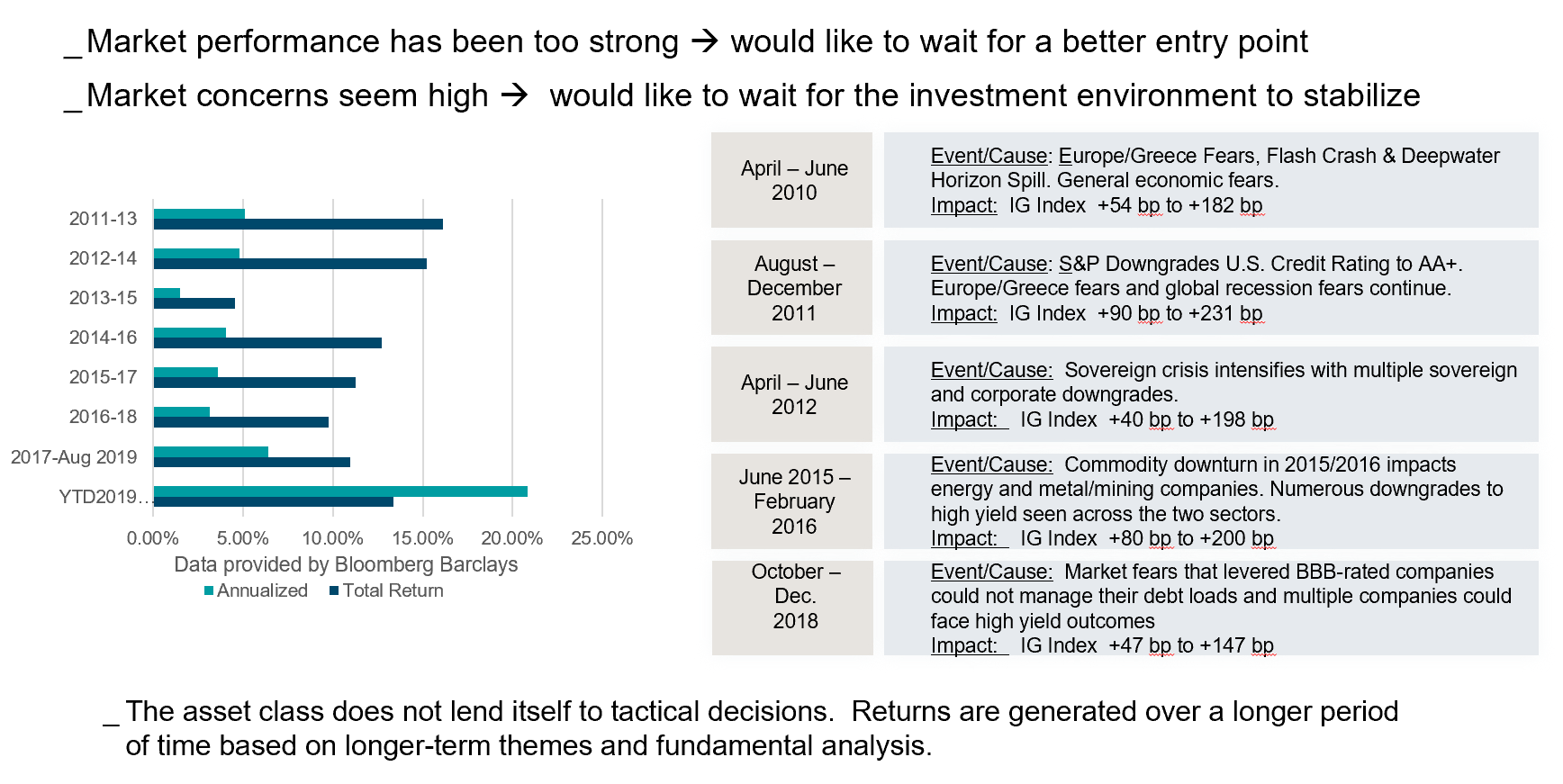 Over the past decade, four significant episodes have occurred in the bond market, some of which include multiple market-roiling events. Returns to investment grade debt have been positive despite these tumultuous periods. If an investor had invested at the beginning of the year and held that investment for the three subsequent years, they would have seen significant, positive total and excess fixed-income returns at the end of the period (based on the Bloomberg Barclays U.S. Investment Grade Index).
