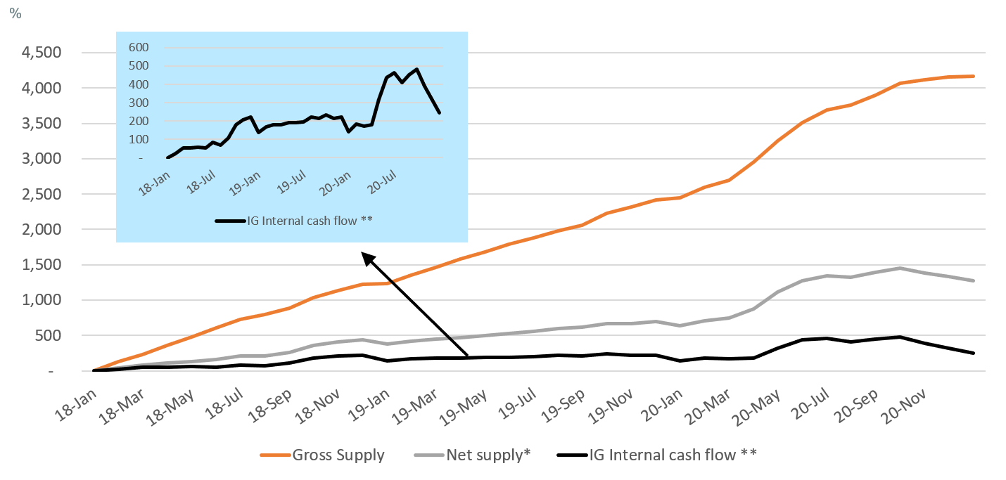 Will this surge in issuance result in lower prices in the near term? This surge is somewhat misleading. To put the issuance of the past two years into context, DWS considered net supply. Net supply takes into account call options, tender offers and repurchases. When these factors are considered, the amount of assets in the market that need to be absorbed, is quite low. As the chart shows (See Figure 3), net supply is declining rapidly.