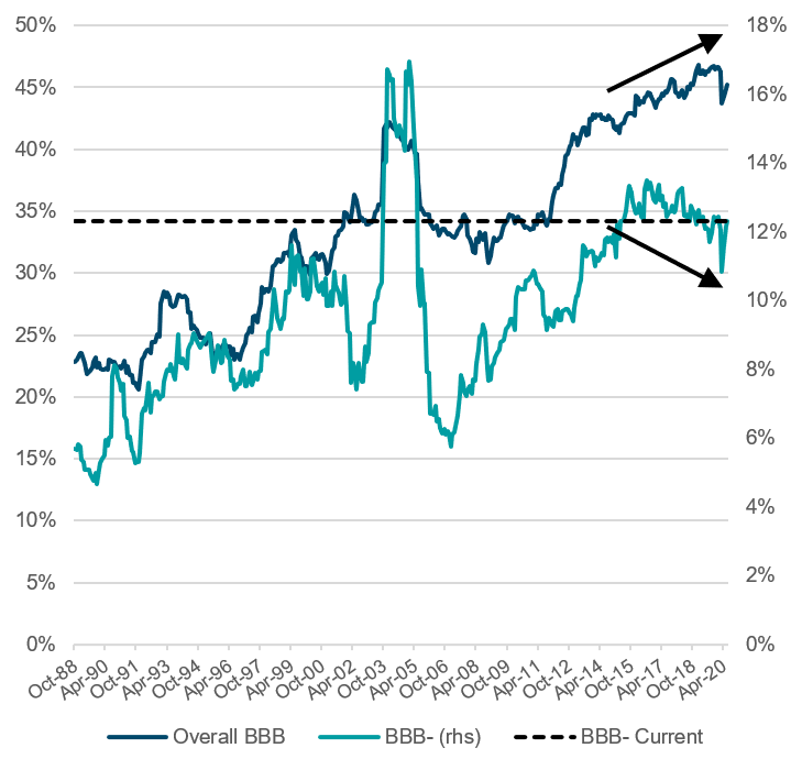 DWS looked at these downgrades in detail and found that there are certain factors driving them. While the number of BBB issues has increased and is likely to exceed the historical high of 50% of the market, the number of BBB- issues has declined. Thus, we believe the concern over the rise in BBB issues is not properly focused, as BBB- issuers pose a higher credit risk.