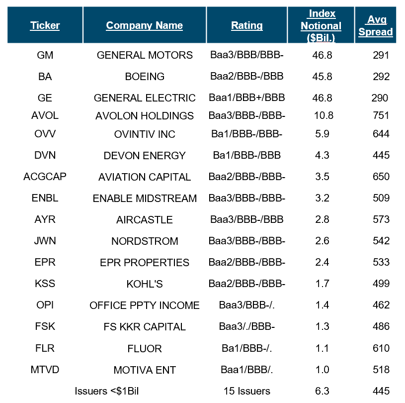 FIGURE 6: POTENTIAL FALLEN ANGELS: GM, BA AND GE PLUS IG INDEX BBB ISSUERS TRADING AT BB-SPREADS OR WIDER