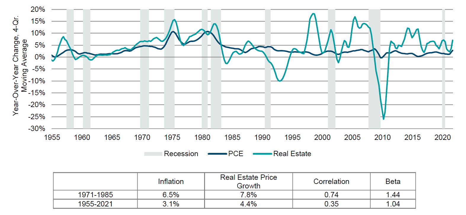 Sources: U.S. Bureau of Labor Statistics, U.S. Board of Governors of the Federal Reserve System as of December 2021. The “transitory versus persistent” debate has not been conclusively settled. However, it has rekindled interest among investors in strategies to mitigate inflation risks. Property has traditionally been viewed as an inflation hedge, and for good reason: Commercial real estate has historically exhibited a strong correlation and an even stronger sensitivity (or “beta”) to rising price levels (see Exhibit 2).20 These relationships appeared even more powerful during the 1970s and early-1980s, when inflationary pressures were more acute. There are two mechanisms through which inflation feeds into real estate prices: Rising (nominal) wages and sales can augment renters’ spending power. Higher construction costs can also constrain competitive supply. Materials prices soared 35% year-over-year in November, while a broader measure that includes wages increased 14% — the fastest increases in 50-70 years.21 Over time, real estate prices have tracked replacement costs, which are directly tied to inflation.