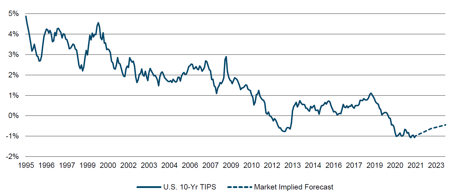 Sources: U.S. Bureau of Labor Statistics, U.S. Board of Governors of the Federal Reserve System as of December 2021. With inflation mounting, the Federal Reserve has signaled its intention to suspend asset purchases in March and lift short-term interest rates several times in 2022. Some investors may wonder whether higher interest rates will undermine real estate valuations. We do not believe so, for several reasons. First, monetary tightening will not necessarily translate into higher long-term interest rates. Second, even if long-term rates were to increase, they should not be divorced from the inflationary context. Given that property is a real asset whose cash flows and intrinsic value increase with inflation (unlike nominal Treasuries), we believe that its valuations are driven more by real interest rates. Real yields (measured by the 10-year Treasury Inflation Protected Security (TIPS)) have hardly moved from their record lows of about -1%, and futures markets imply that they will remain below -60 basis points through 2022 (see Exhibit 3).22 Third, the spread between cap rates and TIPS yields, about 500 basis points (bps), is well above its long-term average (400 bps), suggesting that there is room for real estate to absorb any upward pressure on real rates.23