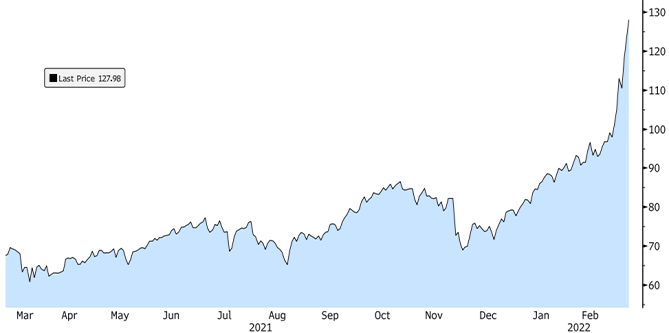 The meteoric rise in oil prices over the past few months reflects tighter physical market fundamentals as the post covid recovery in crude demand kept surprising to the upside, OPEC+ producing fewer barrels vs expectations and OECD crude stocks declining. The surge in oil prices also reflects fears about the potential spare production capacity in a rapidly worsening geopolitical environment amidst a higher possibility of output disruptions. The removal of Russian oil and gas volumes from the market is likely to send energy prices soaring, exacerbate already-high inflation, and slow economic growth globally, a move that would be detrimental to many nations outside of Russia. Volatility in oil prices has also been exceptional because the underlying demand and supply curves are inelastic. Demand is inelastic due to long lead times for right-sizing the levels of fuel-consuming inventory. Supply is inelastic in the short term because it takes some time to alter the production coming out of oil wells.