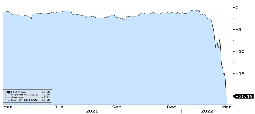 According to EIA’s latest estimates, the Brent price will average $117/b in March, $116/b in 2Q22, and $102/b in 2H22. Finally, settling down around ~$89/b in 2023. However, these estimates remain highly uncertain in the short term. Actual price outcomes will be dependent on the degree to which existing sanctions imposed on Russia, any potential future sanctions, and independent corporate actions affect Russia’s oil production or the sale of Russia’s oil in the global market. In addition, the degree to which other oil producers respond to current oil prices, as well as other macro developments. Investors can see from the chart above that the oil market is currently in steep backwardation, where there is a premium for physical delivery of oil “now”. Oil futures are signaling a very tight physical market and there is a 12-month backwardation of around $30/b. Given the numerous market forces at play, the ultimate landing spot for prices is extremely difficult to determine.