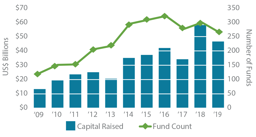 A clear separation between the “haves” and “have nots” has emerged. The 25 largest VC managers have collectively raised more than 50% of all LP commitments over the last decade (even excluding the US$100 billion SoftBank Vision Fund). At the same time, hundreds of new seed funds have emerged. In 2018, funds smaller than US$250 million may have accounted for 74% of all new VC funds raised, but they represented only 16% of the total dollars raised. By contrast, funds larger than US$500 million accounted for 12% of new funds raised, but represented 66% of the total capital raised.2