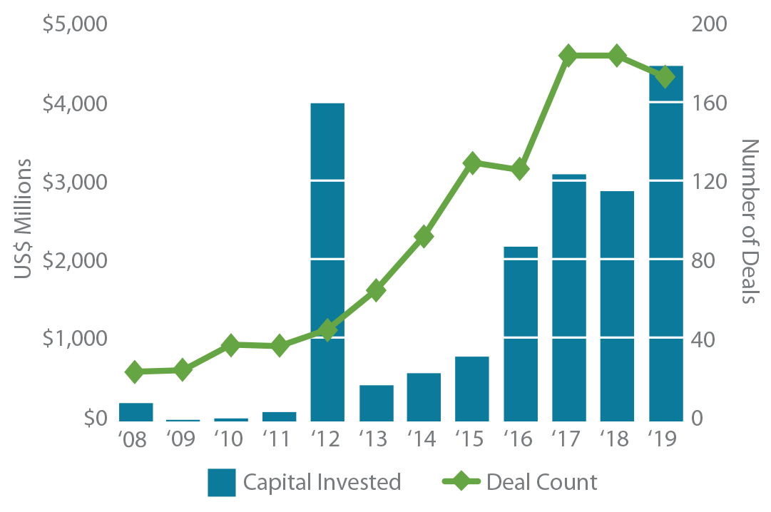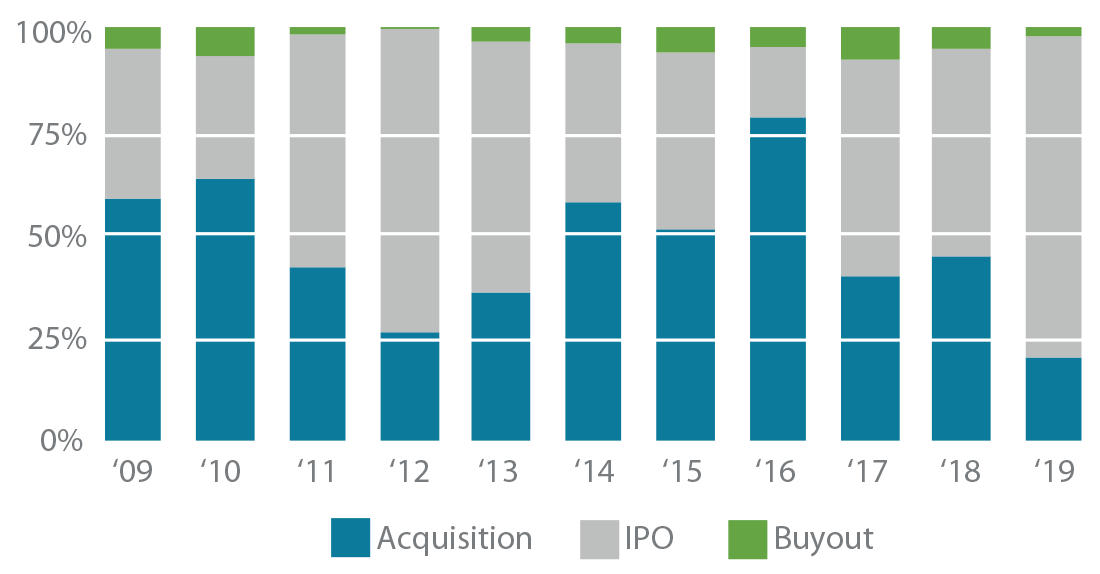 As seen in Figures 1–3, 2018 was a banner year, and that momentum largely continued into 2019. The IPOs of high-profile companies Uber, Zoom, Slack, Pinterest, and Lyft led the way for what was a record year for exit value. This is certainly a welcome development for the LPs that have waited a decade or more to realize these gains and have been constrained in their ability to commit more capital to the asset class.