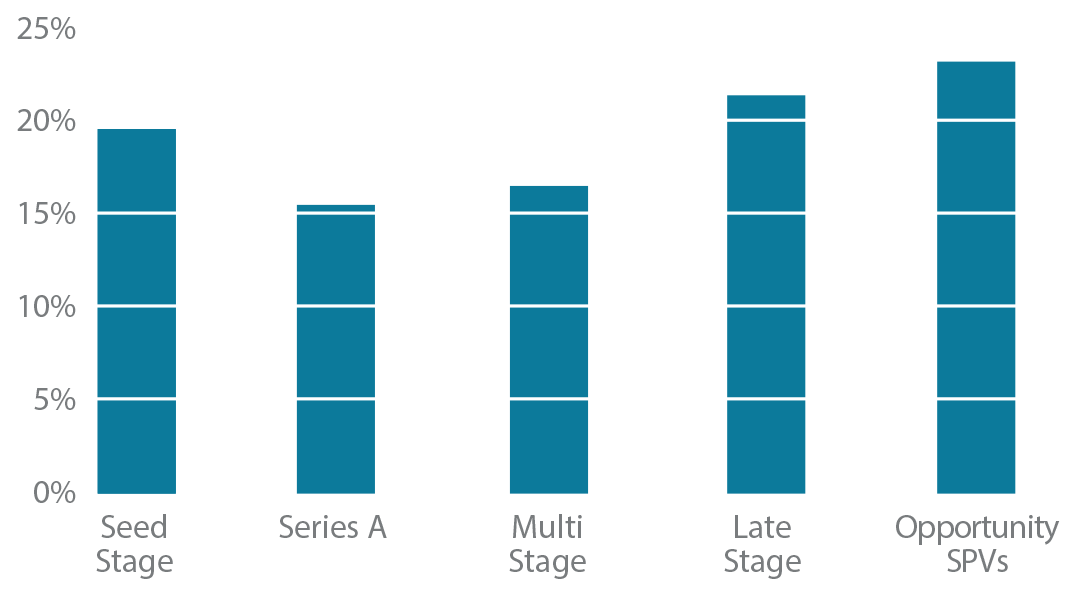 This dynamic helps explain the rise of mega multi–stage VC funds, new entrants to the late-stage market (e.g., SoftBank Vision Fund), opportunity funds, and special purpose vehicles (SPVs), which enable early-stage investors to continue to deploy late-stage capital into their best companies.