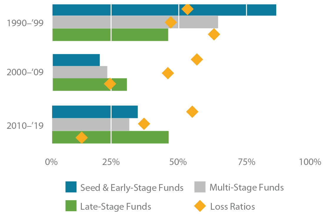 Investments from late-stage GPs (typically Series B or later) have outperformed seed, early-stage, and multi-stage VC funds on average, with a higher gross IRR and TVM and a lower loss ratio. Whereas loss ratios for early-stage VC have held steady at about 50% on average over the last three decades, the loss ratios for late-stage investments have decreased significantly from 59% in the 1990s to 15% in the 2010s.
