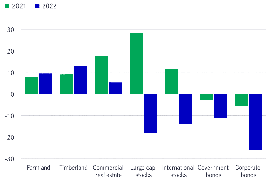 Source: NCREIF, Macrobond, as of December 2022. Returns for farmland, timberland, and commercial real estate refer to the total returns on NCREIF indexes for the respective asset classes. Large-cap stocks are represented by the S&P 500 Index. International stocks are represented by the MSCI EAFE Mid and Large Cap Indexes. Government and corporate bonds are represented by IA SBB US LT Corp TR USDs from Ibbotson Associates. It is not possible to invest directly in an index.