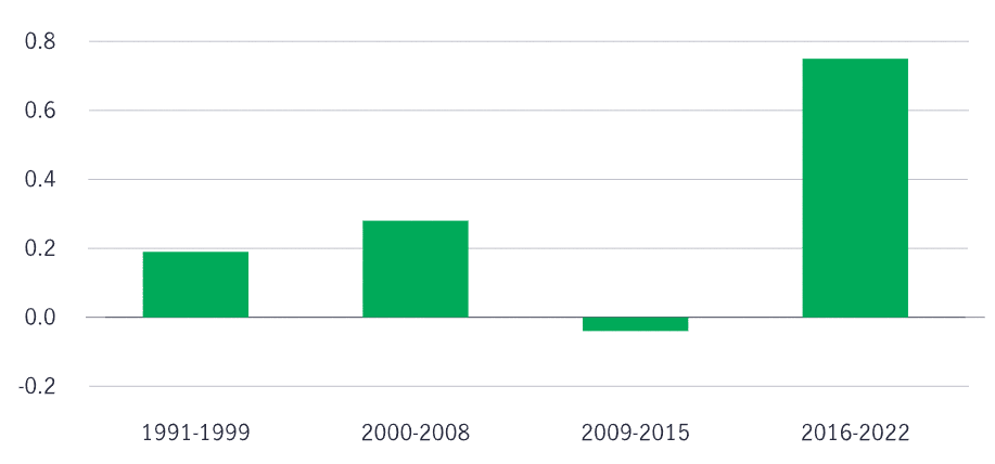 Farmland has historically been regarded as a suitable inflation hedge, despite its marginal aggregate correlation over the last three decades. However, when separated into specific economic periods, the inflation-hedging potential of farmland investments becomes more readily apparent, with returns improving in periods of rising inflation (positive correlation in 1991-1999, 2000-2008, 2016-2022) and remaining positive in periods of limited inflation (negative correlation in 2009-2015). In addition to potential inflation-hedging characteristics, farmland can play a role in improving the overall performance of a mixed-asset portfolio through diversification, due to its low correlation with traditional financial assets.